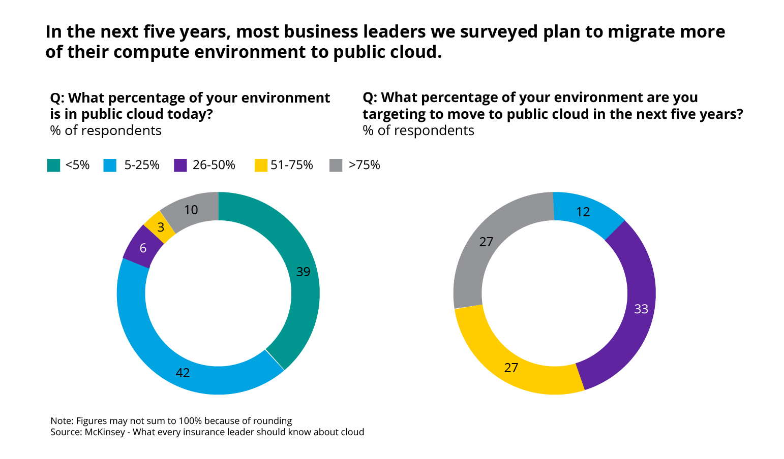 Most insurers have yet to move most of their operations to the cloud. One McKinsey survey showed that 81% of business leaders had under 25% of their environments running in the cloud. Over half of them planned to move more than 50% of their environment to the cloud by 2025.