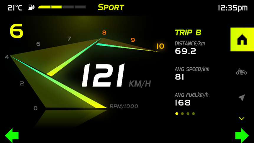 The IC of a motorbike differs in many aspects from that of a car. Firstly, a motorbike offers less space for a display. Due to this limited space, information from the infotainment system (such as guidance, music and telephony) must be shown on the same small display as the motorcycle-specific data. Secondly, IC operation poses a challenge: While in motion, safe operation of the system is only possible via buttons on the handlebars. While stationary, touch screen can be operated, but they are difficult, as the driver usually wears thick gloves. Similarly, helmets can restrict visibility. Finally, while the IC is exposed to weather and light conditions, it must maintain display readability even in adverse conditions. All these aspects have to be considered when designing an IC for a motorbike.