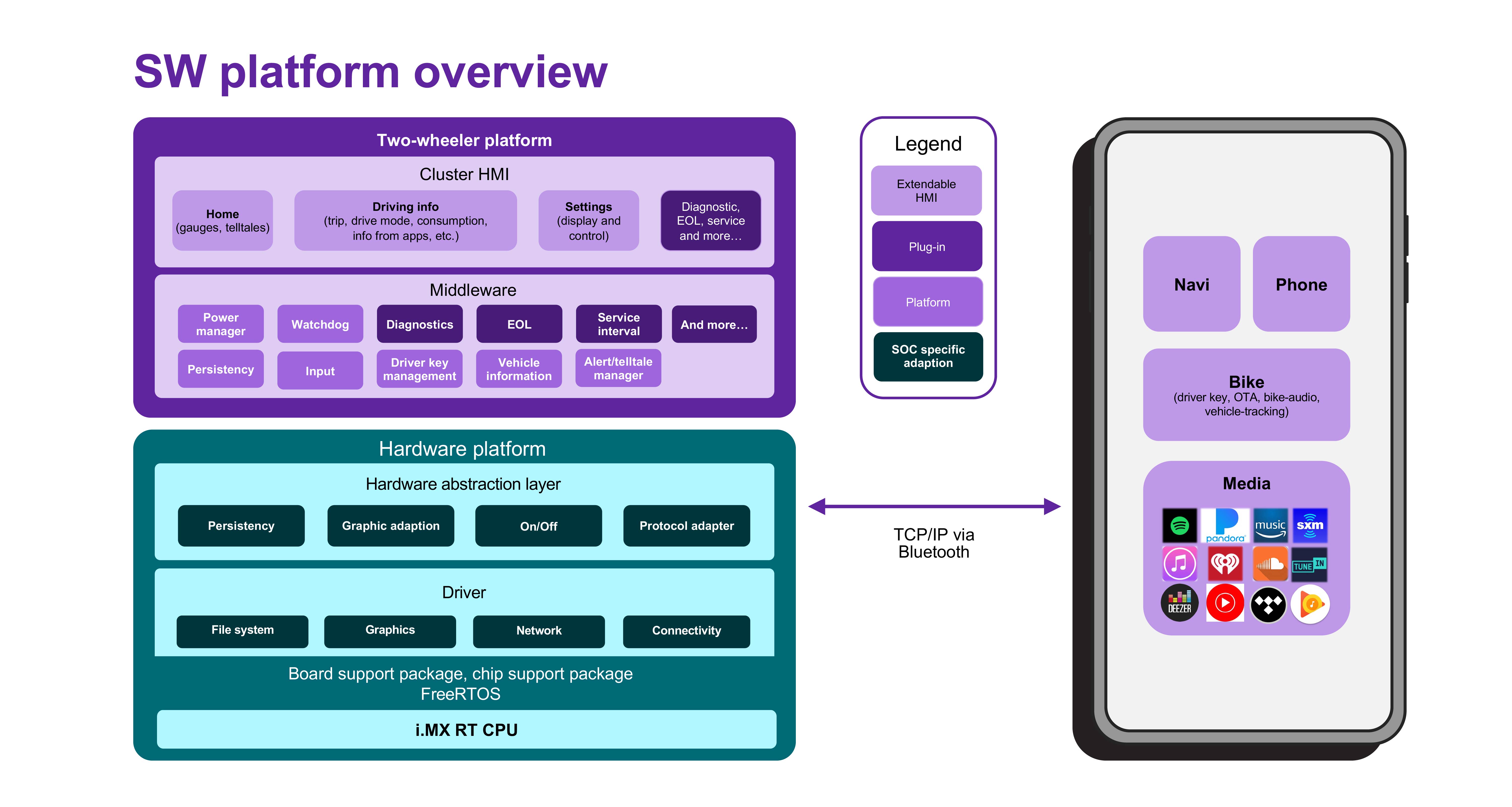 Whereas the functionality is similar for all manufacturers, each brand has a specific corporate design. The type of customer and their motorbike riding habits also call for a distinctive HMI — just-for-fun cruisers enjoy a different look-and-feel than speed enthusiasts. HMIs must meet the requirements of both motorbike variants and UI/UX expectations of the respective market, and they must support different display sizes/formats and presenting variants. So, building a reusable platform using identical software features is a logical step to saving time and money while maintaining high quality. This platform approach combines the reusable platform module, a hardware abstraction layer of some kind and an interchangeable HMI part.