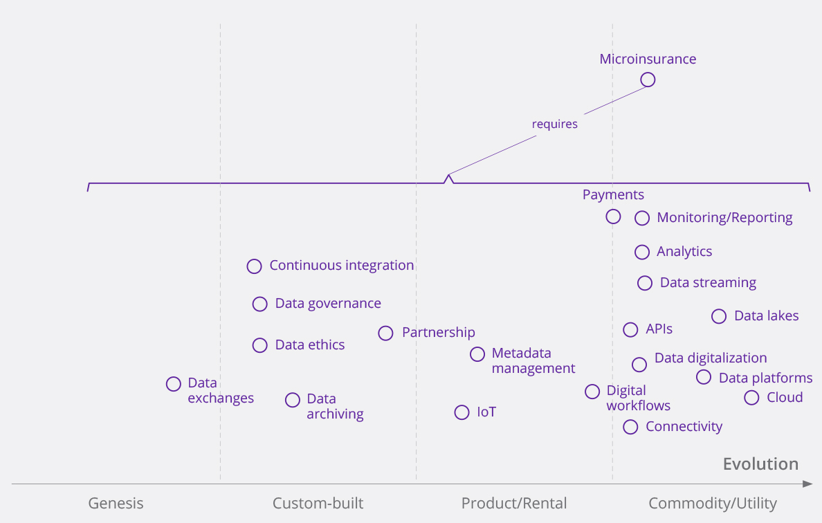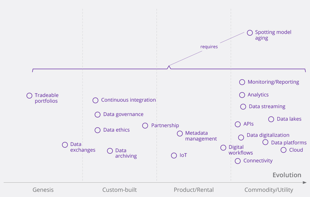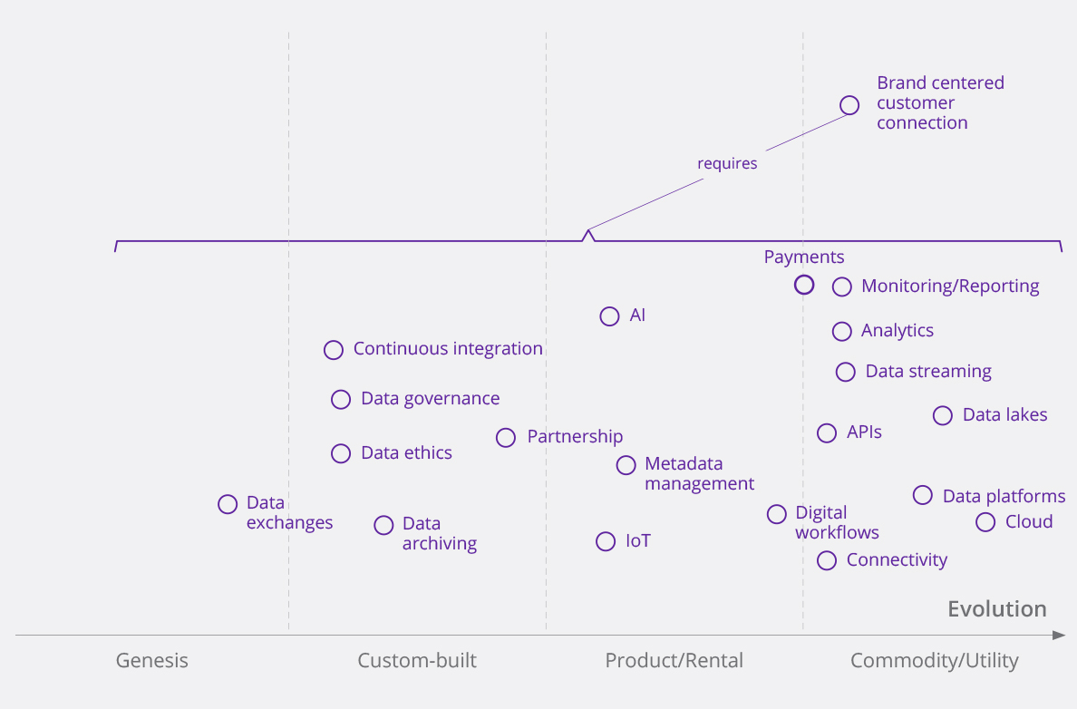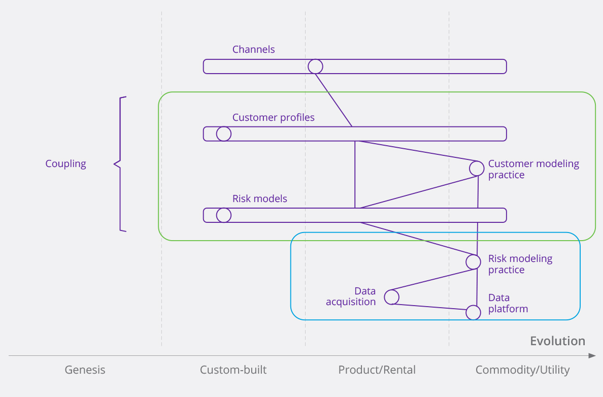 One of the patterns that Wardley mapping helps to identify is that efficiency in one area of a map (blue rectangle) enables efficiency in other areas of the map (green rectangle). In other words, a mature and standardized way of handling data can accelerate product development and improve the product-market fit.