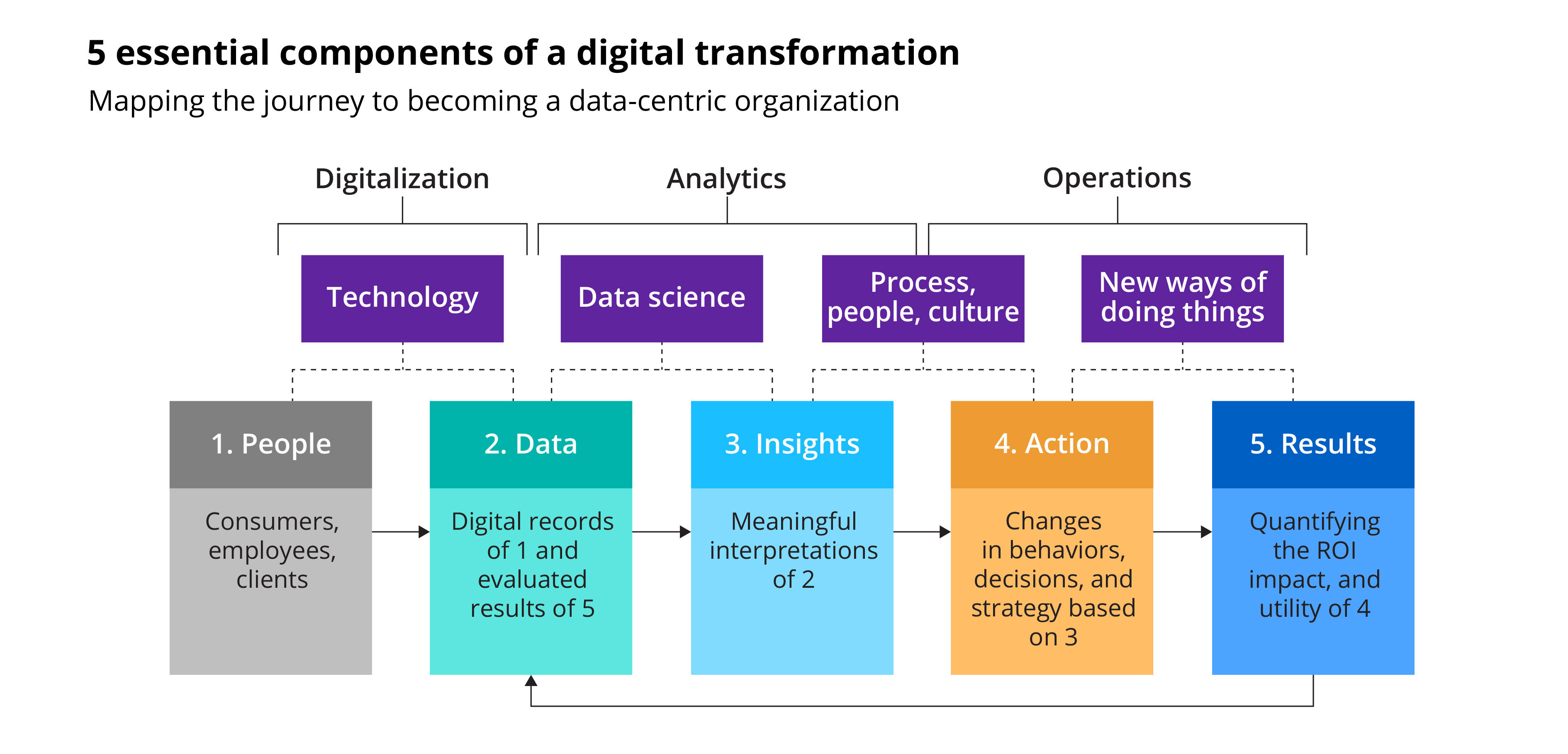 As Harvard Business Review puts it, digital transformation relies on five essential components: