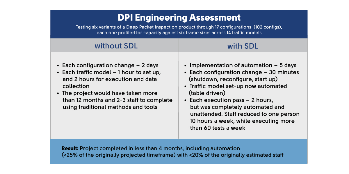 Organizations with fully virtualized and automated software testing solutions (supported by products like SDL) benefit from much lower test costs and faster time-to-market – higher profit margins, sooner. An accelerated product pipeline enables early market share for new services.