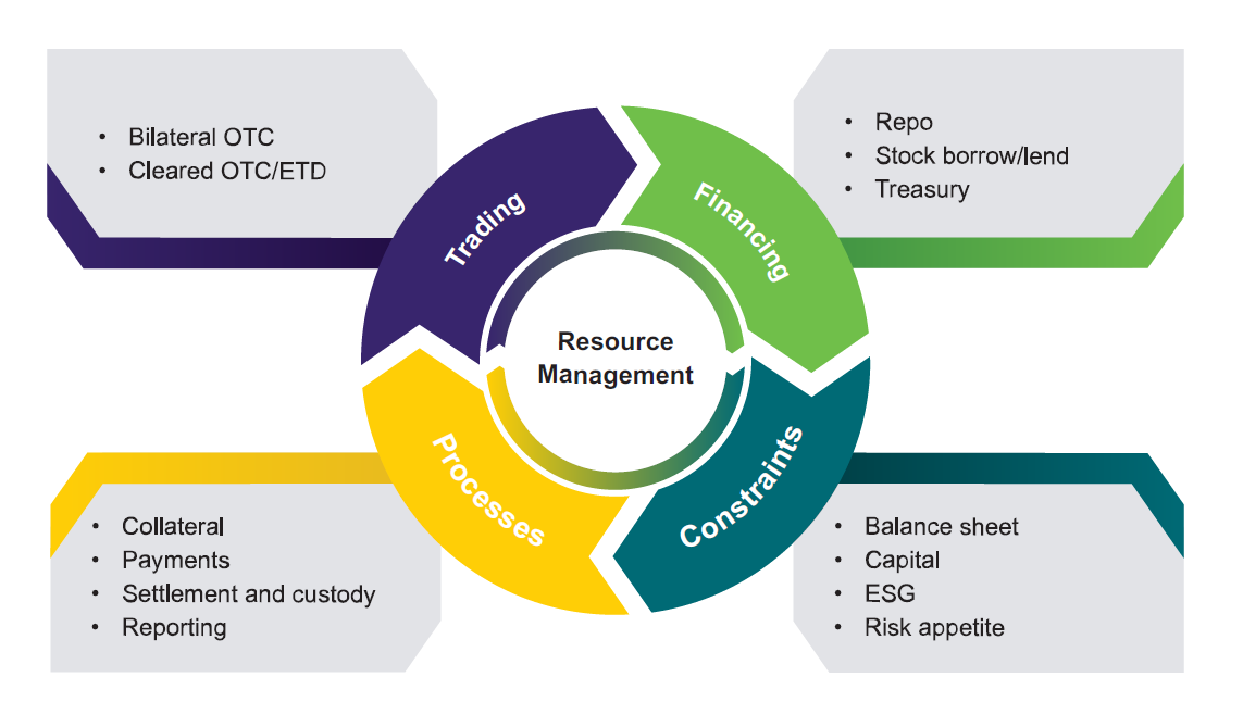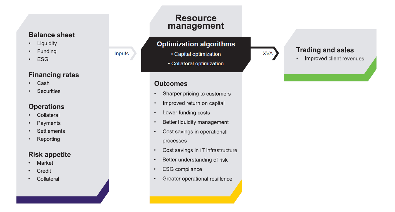In response, leading banks are bringing collateral and capital optimization together within a new firmwide financial resource management function. Resource management is typically tasked with collateral and capital optimization within balance sheet, ESG, operational and risk constraints and to price collateral and capital for Trading and Sales desks to drive client revenues.