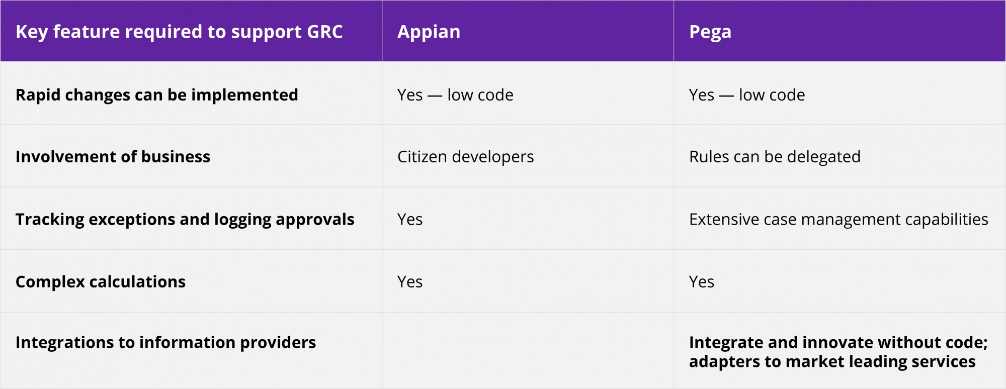 Low code is the ideal choice for governance, risk and compliance (GRC) applications because the speed of app development helps manage the dynamic nature of global regulations. Other key requirements met by LCAPs like Appian and Pega are as follows: