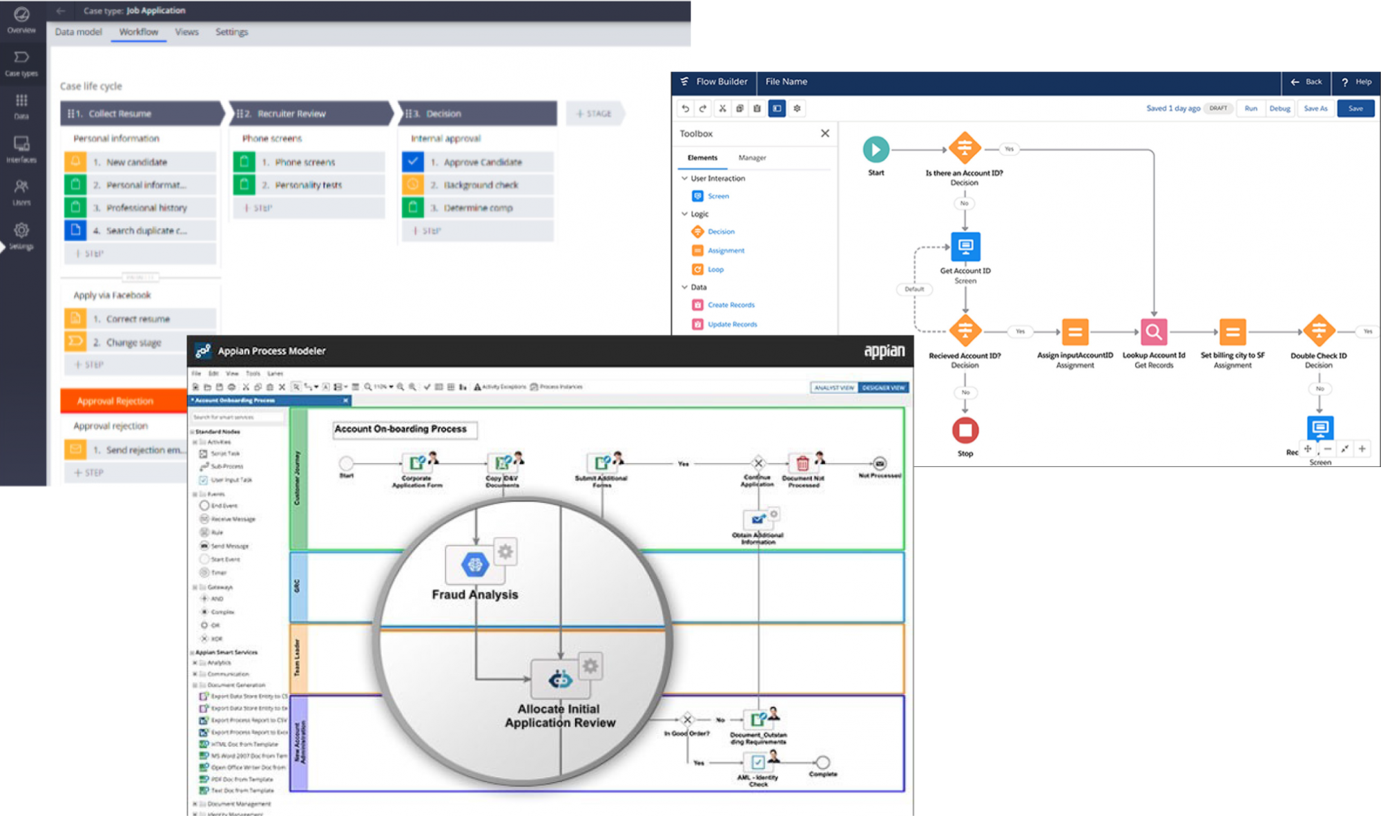 Appian received Gartner’s highest use-case score for business workflow automation. It also received good scores for custom business applications and collaborative app development use cases. It’s heritage in the BPM market underpins strong capabilities in this area. The Appian Process Modeler is a business process and model notation (BPMN)-compliant visual designer that enables users to easily build-out complex process flows.