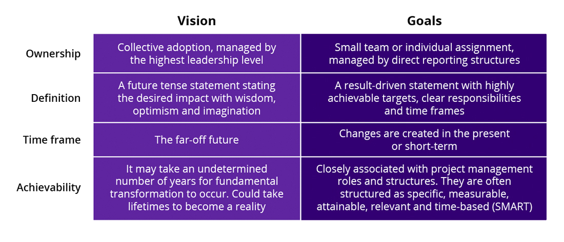 Vision and goals are on opposite sides of the spectrum and support success in different ways. A vision is achieved with collective accountability; a goal is achieved with individual or smaller group responsibilities.