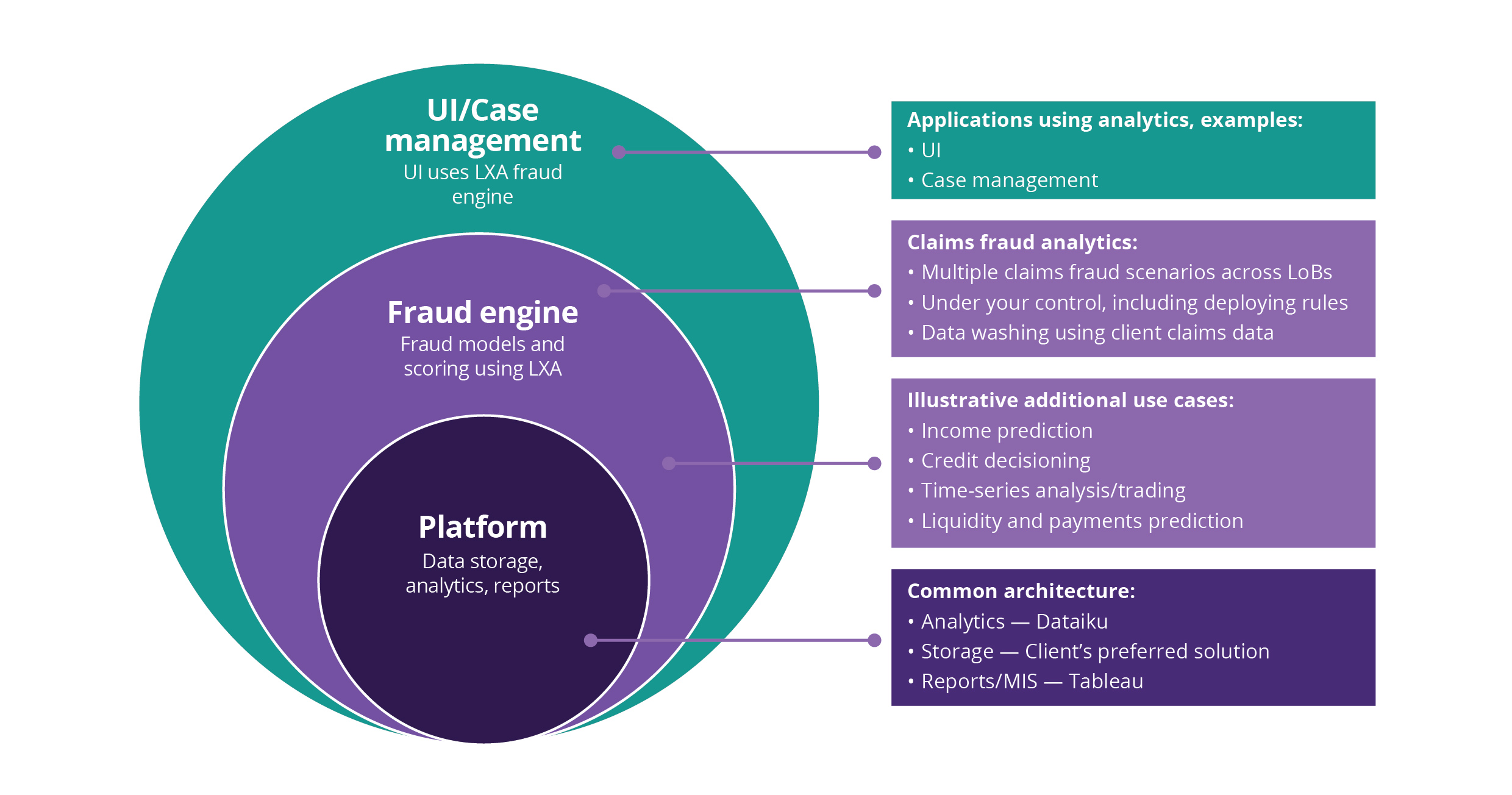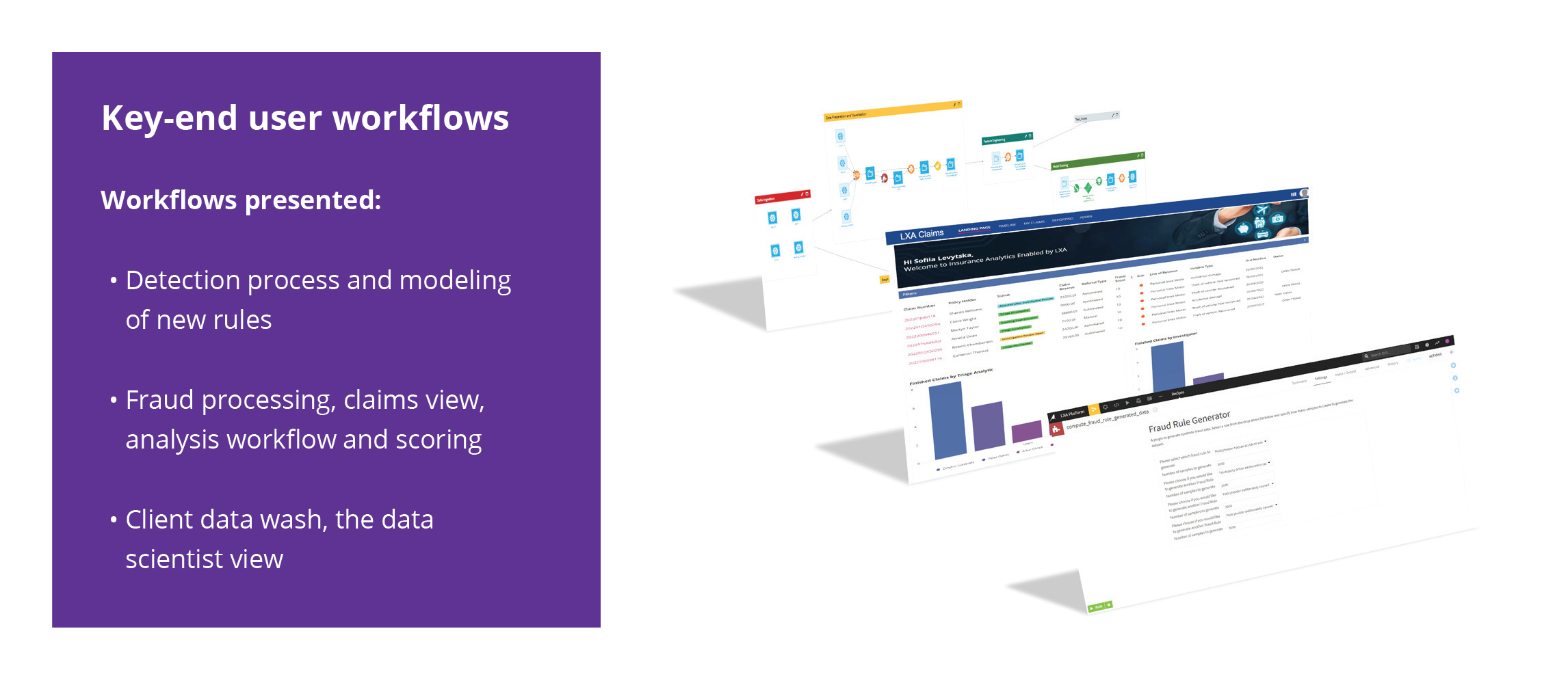 We spent a long time developing the platform and one of the major benefits is that clients have a very short time to value for their deployment. Because LXA is a single generic platform, clients and their customers benefit from visually appealing workflows, and it provides an easy way to prepare for next-generation analytics. Here’s an example of key end-user workflows from an insurance claims fraud use case: