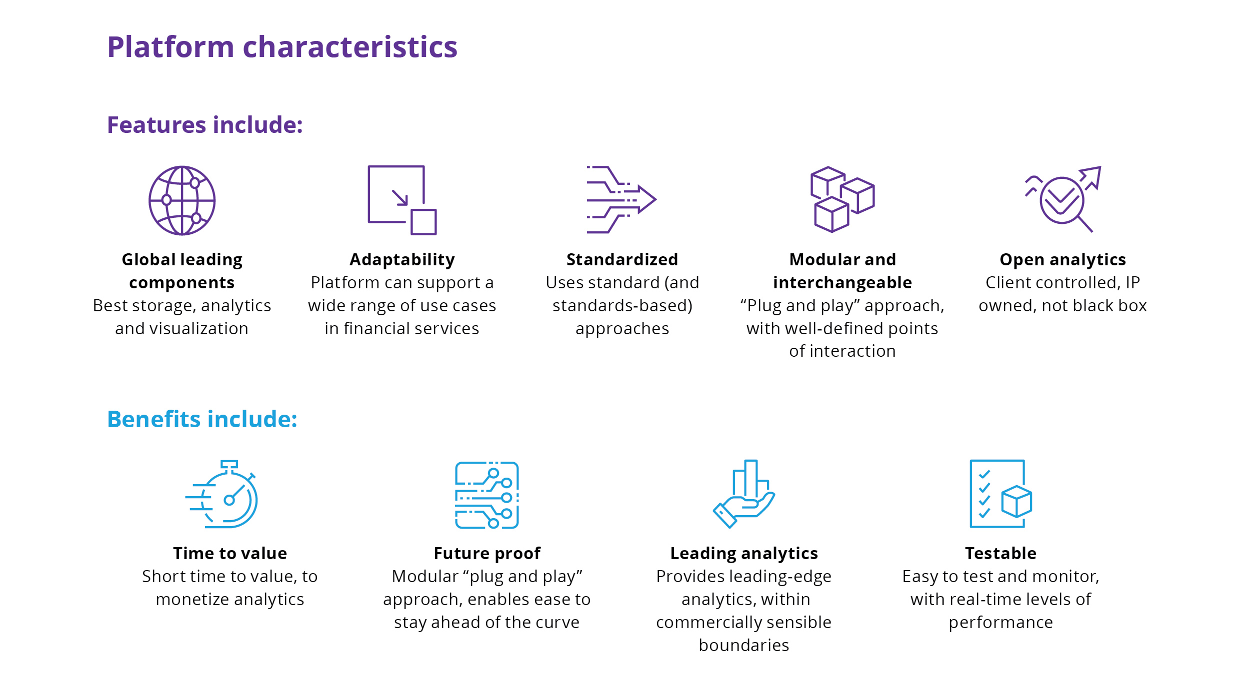 The second layer in the above diagram refers to the things you build using the platform. This is really where Fintego’s accelerators and IP come in, because the value we add is not solely about supplying great analytic experts and top data scientists. It’s also the fact that their deep knowledge and expertise is alloyed with the skill and understanding of our subject matter experts.
